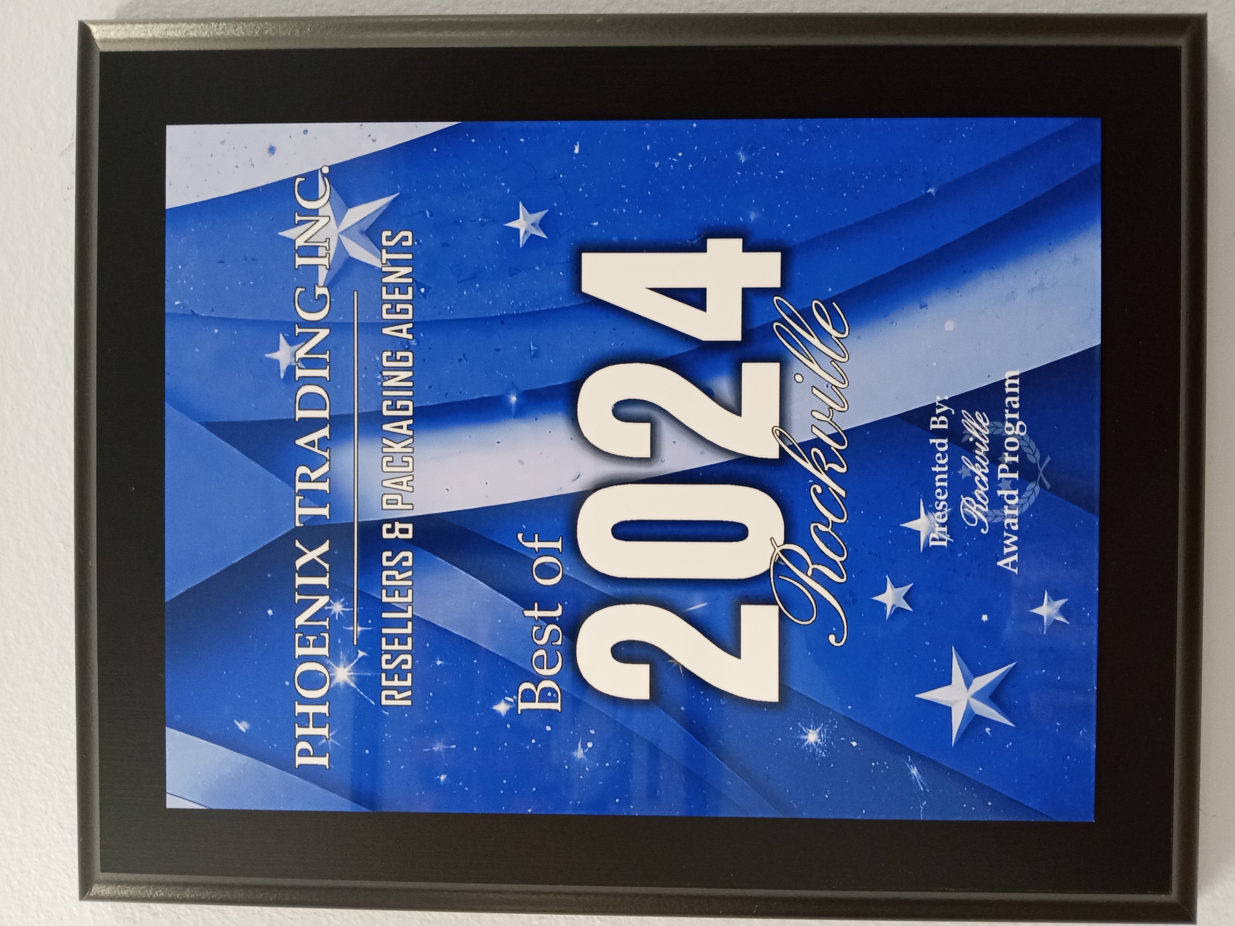 PHOENIX TRADING INC. has been selected for the 2024 Best of Rockville Award in the RESELLERS & PACKAGING AGENTS category by the Rockville Award Program.