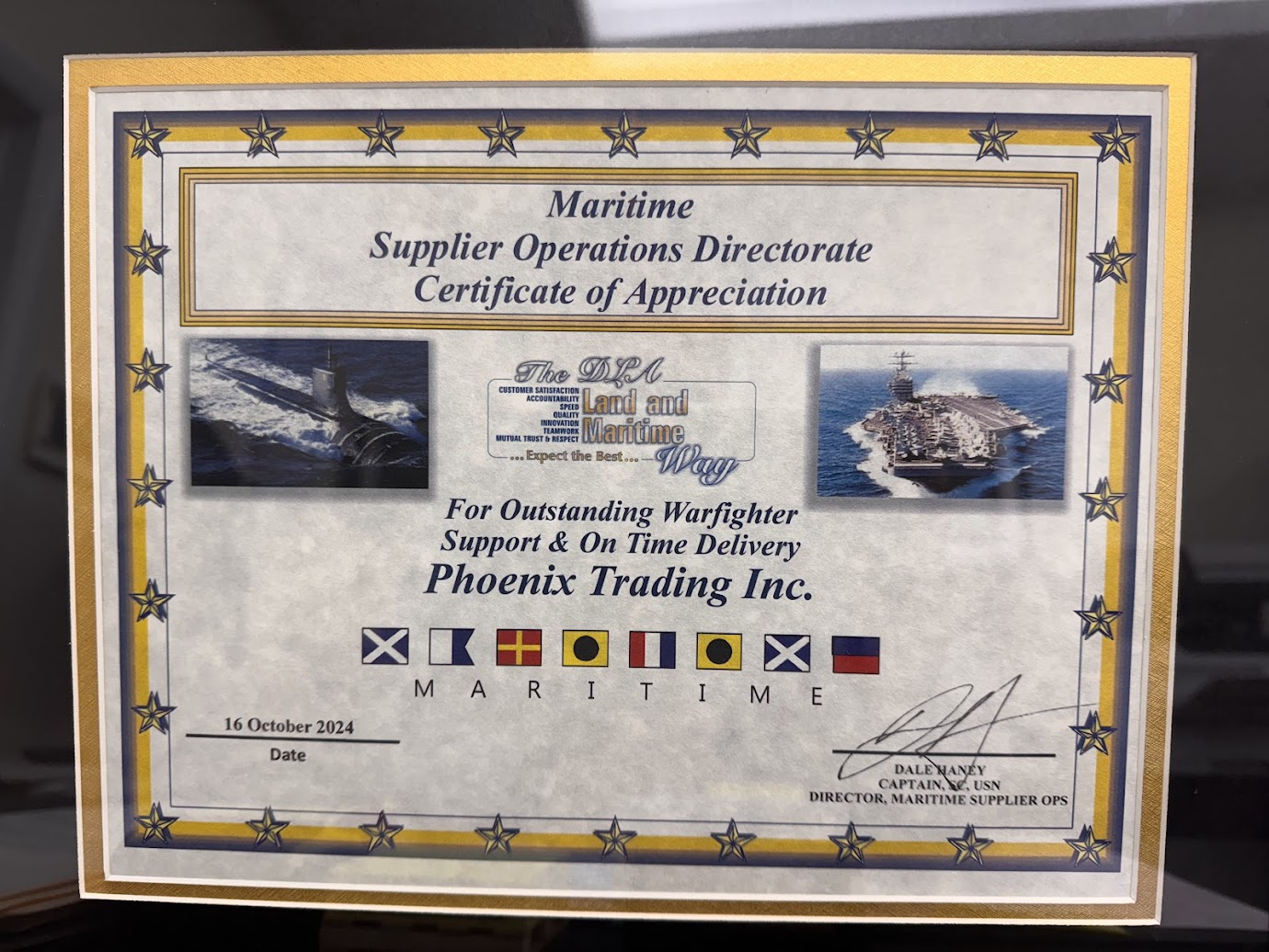 Phoenix Trading Inc. is proud to announce it has been awarded a Certificate of Appreciation by DLA Land and Maritime’s Supplier Operations Directorate for exceptional support to U.S. warfighters.